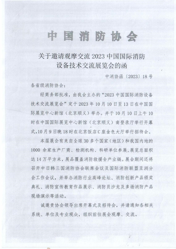 现将中国消防协会《关于邀请观摩交流2023中国国际消防设备技术交流展览会的函》转发你们,望各单位结合各自情况自愿参观。