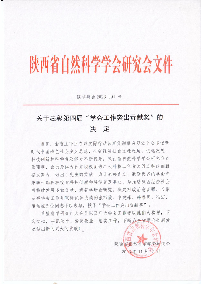 会议传达了省科协的有关会议精神,总结了学研会2023年重点工作,组织与会代表围绕“新形势下学会开展继续教育的问题与对策”为主题展开了热烈的发言和讨论,重点表彰了长期从事学会工作、积极投身科技创新和科学普及事业并取得优秀成绩的学会干部,我会秘书长卞建峰被授予陕西省自然科学学会研究会第四届“学会工作突出贡献奖”。
