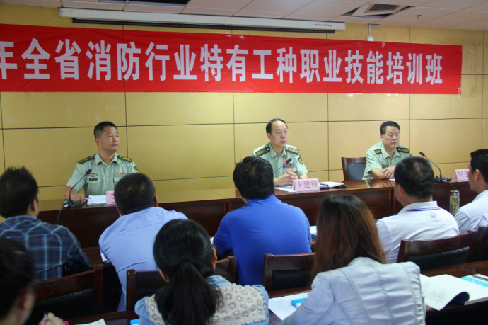 卞秘书长总结了今年以来全省消防行业特有工种职业技能培训工作取得的成绩和经验,对下一阶段培训工作提出了明确要求。同时,对全体培训学员提出了具体要求:一是提高认识,珍惜学习机会。要求大家充分认识参加此次培训的必要性和重要性,端正学习态度,集中精力,排除干扰,把握此次培训机会;二是理论联系实际,切实提高实际操作能力。加强沟通交流,相互学习借鉴,熟练掌握各类消防设施设备的操作方法,初步达到初级建(构)筑物消防员的要求;三是在管理中要实行半军事化管理,全体学员要严格遵守培训班各项管理规定,坚持请销假制度,自觉维护课堂纪律,争取以优异的成绩圆满结业。四是要将所学到消防知识充分运用到日常工作中,积极主动地发挥职能作用。